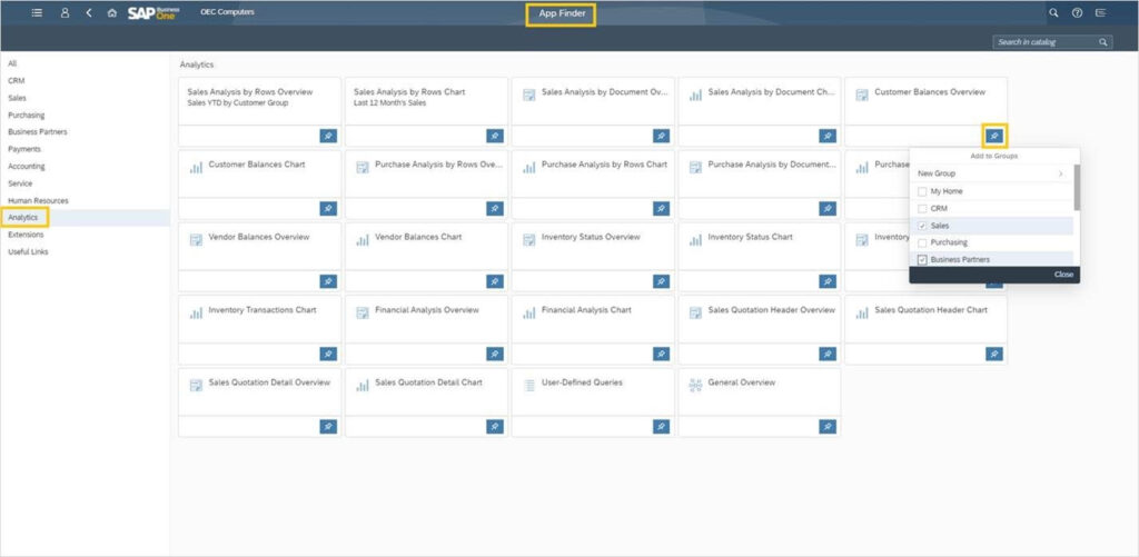 Step 2: Click the “Pin” button of the relevant app and select the groups to which this app should be assigned. You may also create a new group if needed. I will assign “Customer Balances Overview” to Sales and Business Partners in this example.